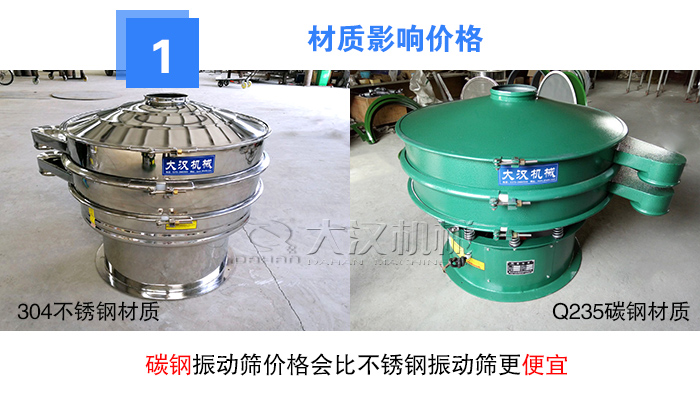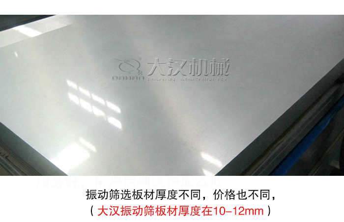 振動(dòng)篩材質(zhì)一般分為Q235碳鋼材質(zhì)與304不銹鋼材質(zhì)(也有使用316L不銹鋼),選用不同材質(zhì)的振動(dòng)篩,其價(jià)格是不同的,碳鋼振動(dòng)篩價(jià)格會(huì)比不銹鋼振動(dòng)篩更便宜,而且振動(dòng)篩選板材厚度不同,價(jià)格也不同,板材足夠厚,篩機(jī)使用更長久(大漢振動(dòng)篩板材厚度在10-12mm)。
