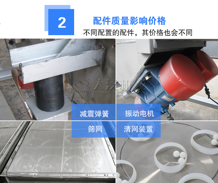 振動(dòng)篩配件主要有振動(dòng)電機(jī)、減震彈簧、篩網(wǎng)、清網(wǎng)裝置組成,選擇不同配置的配件,其價(jià)格也會(huì)不同。